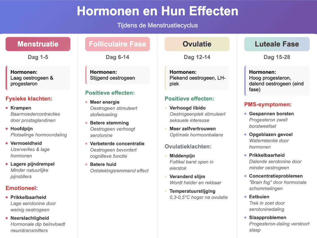- Luteale fase (dag 15-28): Progesteron stabiliseert, dan daling → menstruatie