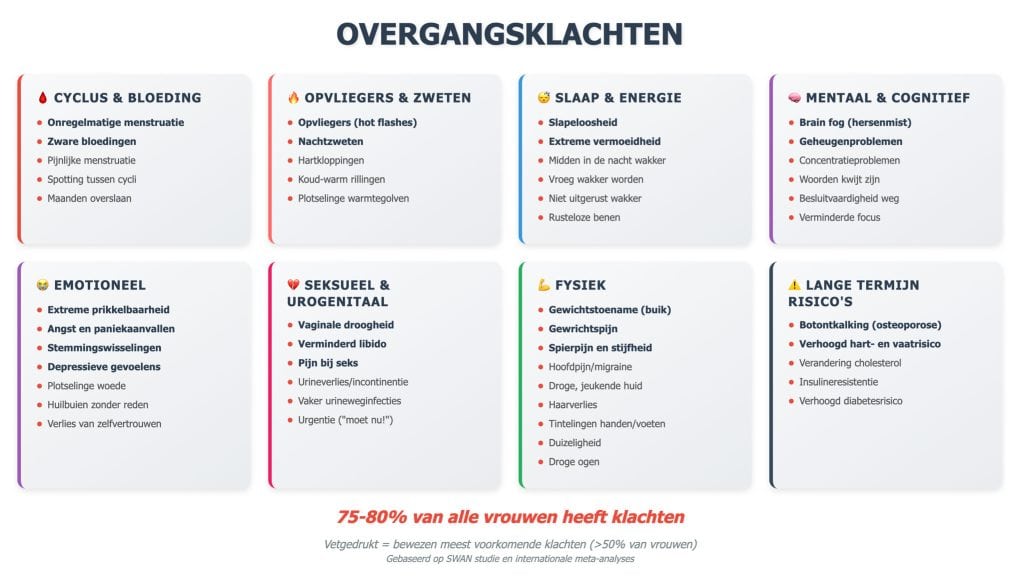 - Cognitief: Brain fog, concentratieproblemen (60% van vrouwen)