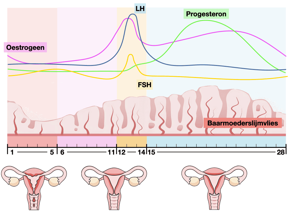 - Vroege foliculaire fase (dag 1-12): FSH stimuleert follikels, oestrogeen stijgt